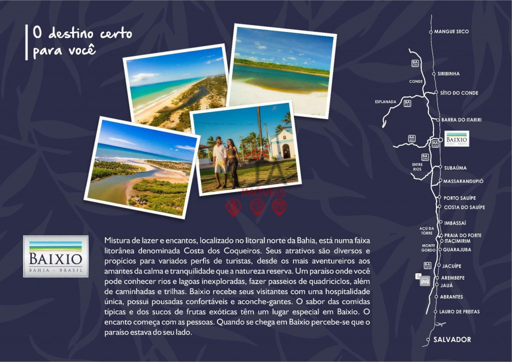 Um convite para o paraíso inesperado mistura de lazer e encantos, aqui o visitante conhece o que há de mais belo na natureza. Localizado no Litoral. Norte da Bahia, está em uma faixa litorânea denominada Costa dos Coqueiros. Seus atrativos são diversos e propícios para variados perfis de turistas, desde os mais aventureiros aos amantes da calma e tranquilidade que a natureza reserva. Um encontro perfeito entre o mar e o Rio Inhambupe. É nesse cenário exclusivo que está localizado este singular empreendimento. O Rio Inhambupe nasce no município de Teofilândia/BA e desemboca na região de Baixio, na Costa Litorânea do município de Esplanada. O empreendimento teve o seu nome inspirado nesse Rio, que em tupi significa “Rio dos Inhambus”, espécie de pássaro com vôo baixo, que se abriga no mato, frequente na região. A Ponta de Inhambupe conta com total estrutura hoteleira e imobiliária, perfeita para o descanso e lazer. Possui um charmoso Hotel Boutique, com localização privilegiada. Além disso, oferece opções imobiliárias diferenciadas com casas residenciais (town house), apartamentos de 2 e 3 quartos, clube social, deck’s lazer, quadra poliesportiva, guarita, apoio de praia e área comercial com restaurantes, quiosques e lojas.