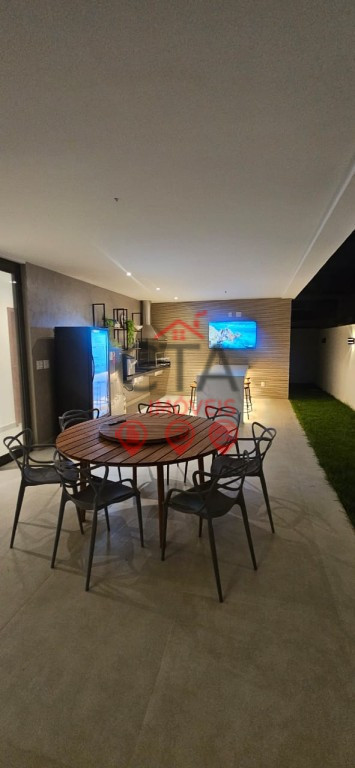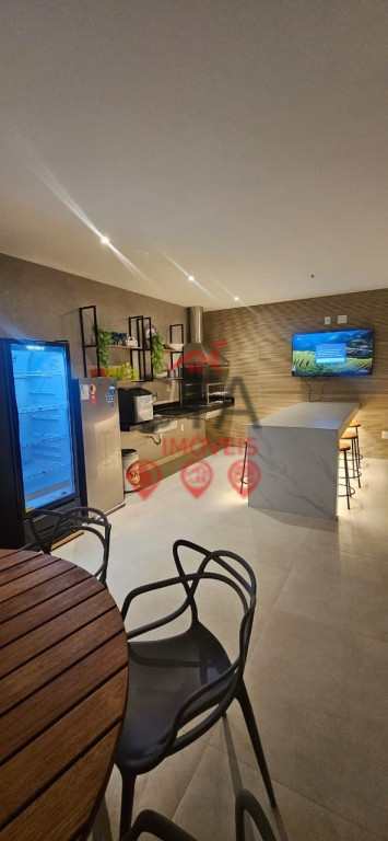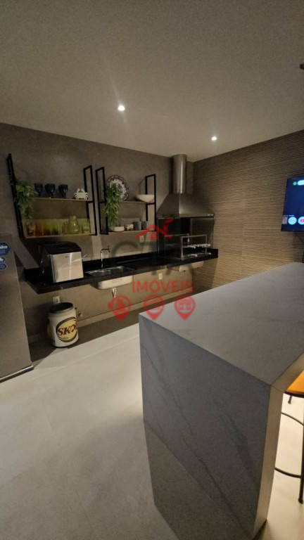 Espaço gourmet completo com ilha, TV e churrasqueira.