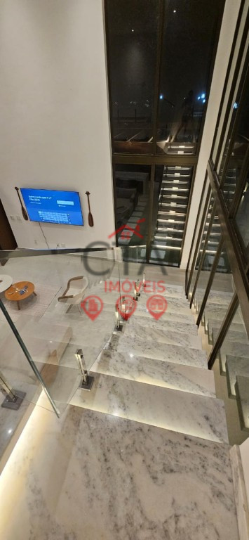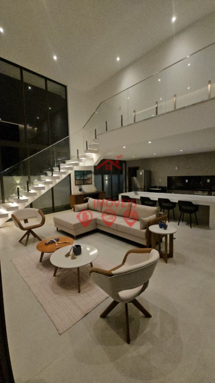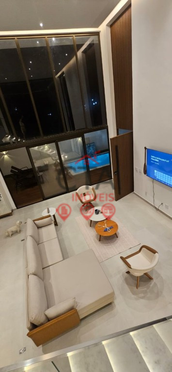 Salas amplas com paredes de vidro e pé-direito duplo, cozinha gourmet integrada, lavabo, despensa e depósito.