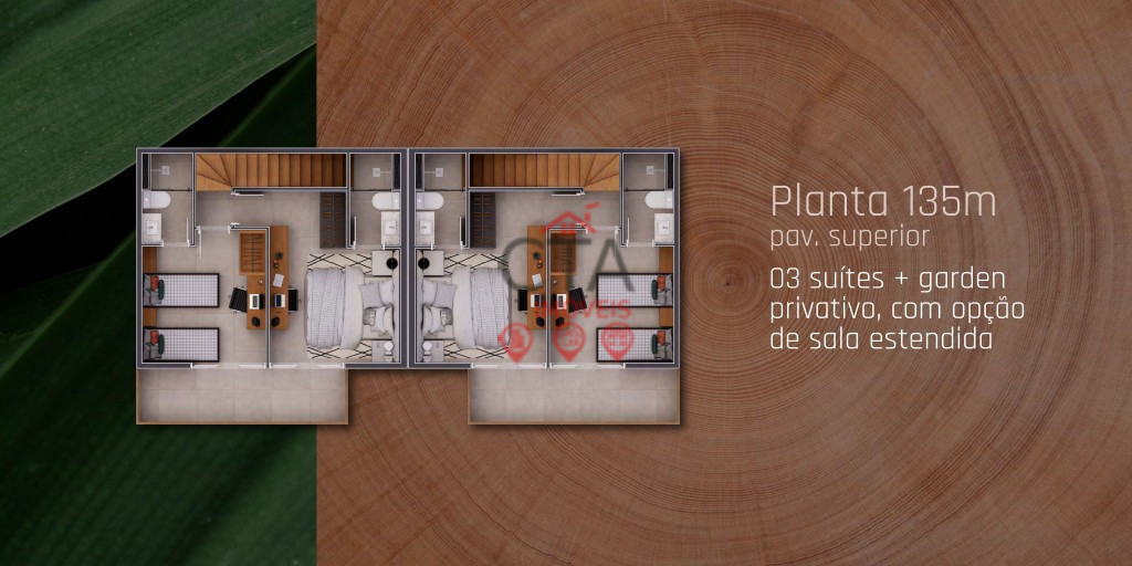Casas de 135m²: 3 suítes + garden privativo, com opção de sala estendida.