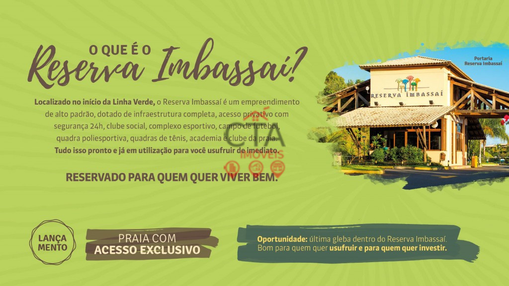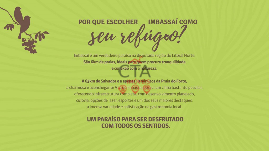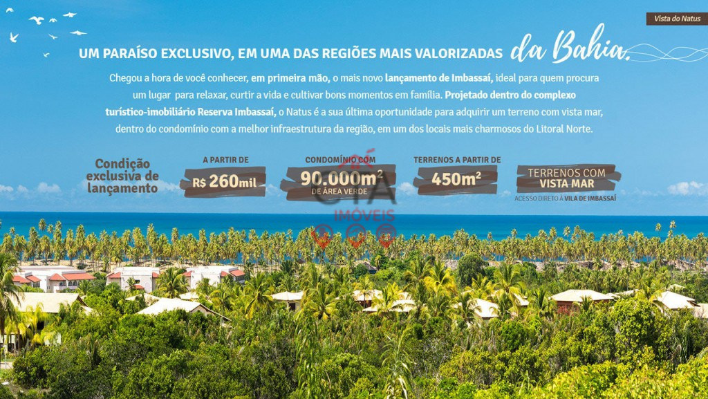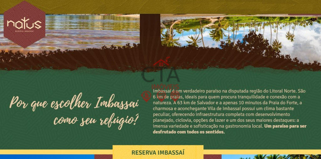 Natus Imbassaí Natus. Um paraíso exclusivo em uma das regiões mais valorizadas da Bahia. Por que escolher Imbassaí como seu refúgio? Imbassaí é um verdadeiro paraíso na disputada região do Litoral Norte. São 6 km de praias, ideais para quem procura tranquilidade e conexão com a natureza. A 63 km de Salvador e a apenas 10 minutos da Praia do Forte, a charmosa e aconchegante Vila de Imbassaí possui um clima bastante peculiar, oferecendo infraestrutura completa com desenvolvimento planejado, ciclovia, opções de lazer e um dos seus maiores destaques: a imensa variedade e sofisticação na gastronomia local. Um paraíso para ser desfrutado com todos os sentidos.